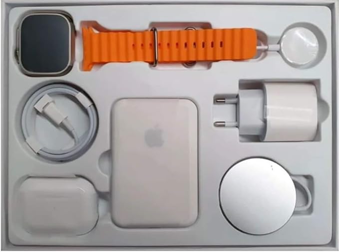 Combo incluye, smartwatch tipo Ultra, audífonos Pro inalámbricos, batería externa, cargador inalámbrico, cubo cargador y cable de carga tipo a lightning,